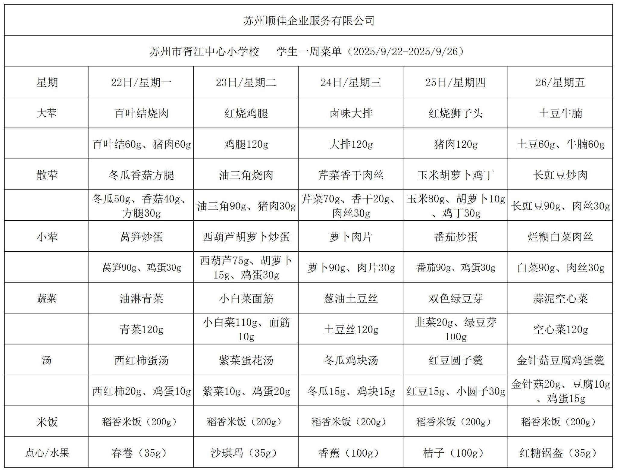 苏州市胥江中心小学校每周食谱2025.9.22-2025.9.26