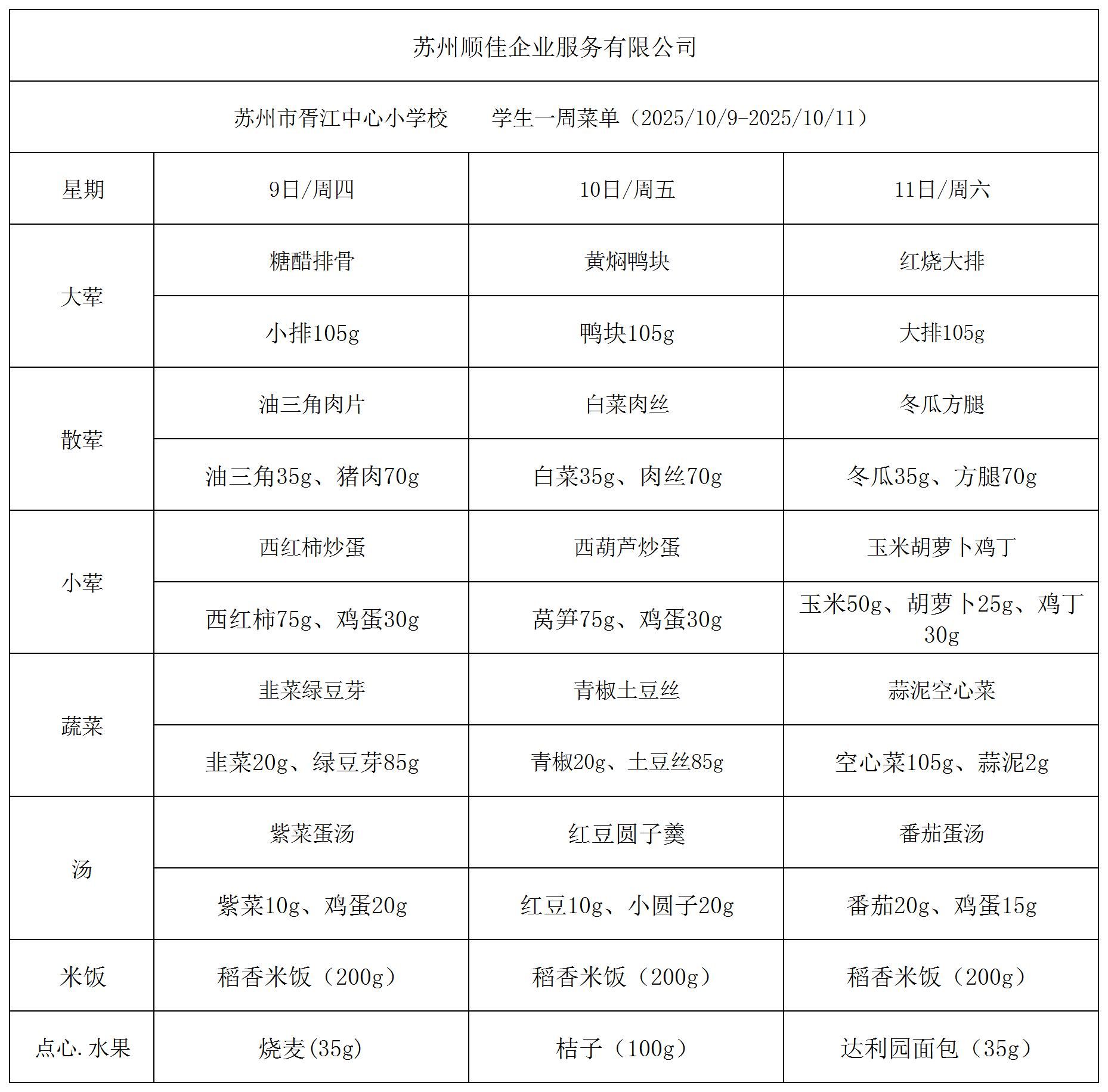 苏州市胥江中心小学校每周食谱2025.10.9-2025.10.11