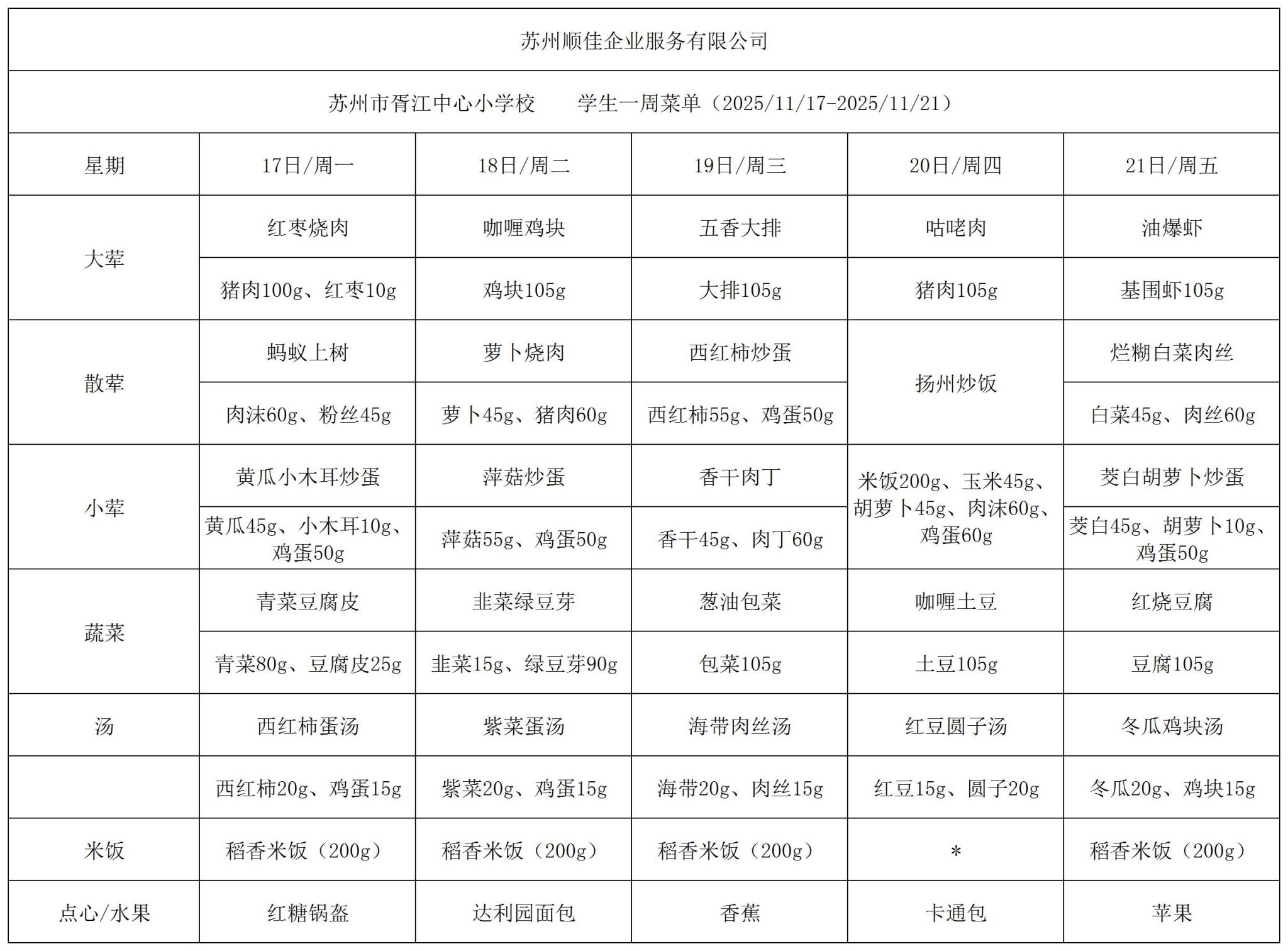 苏州市胥江中心小学校每周食谱2025.11.17-2025.11.21