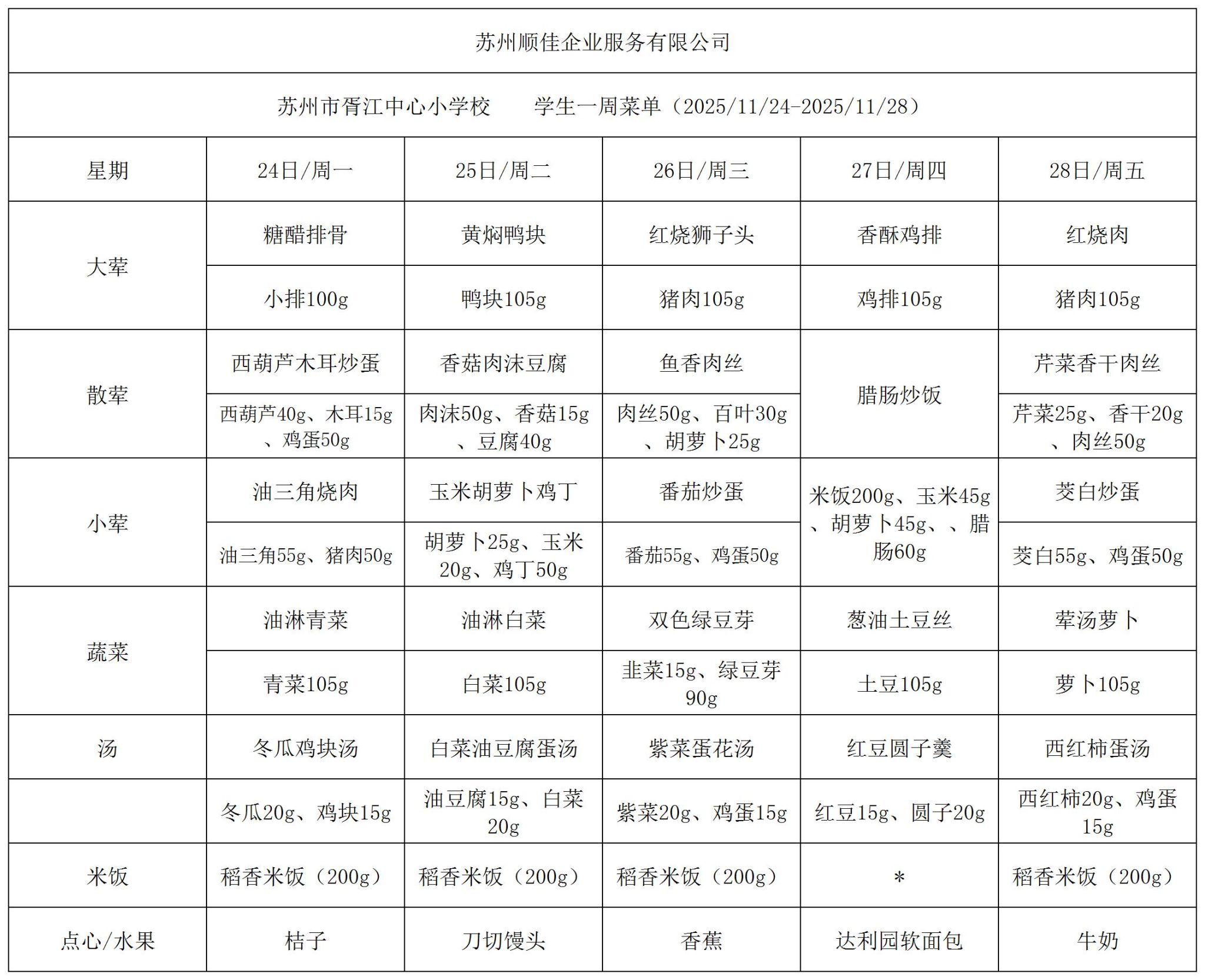 苏州市胥江中心小学校每周食谱2025.11.24-2025.11.28