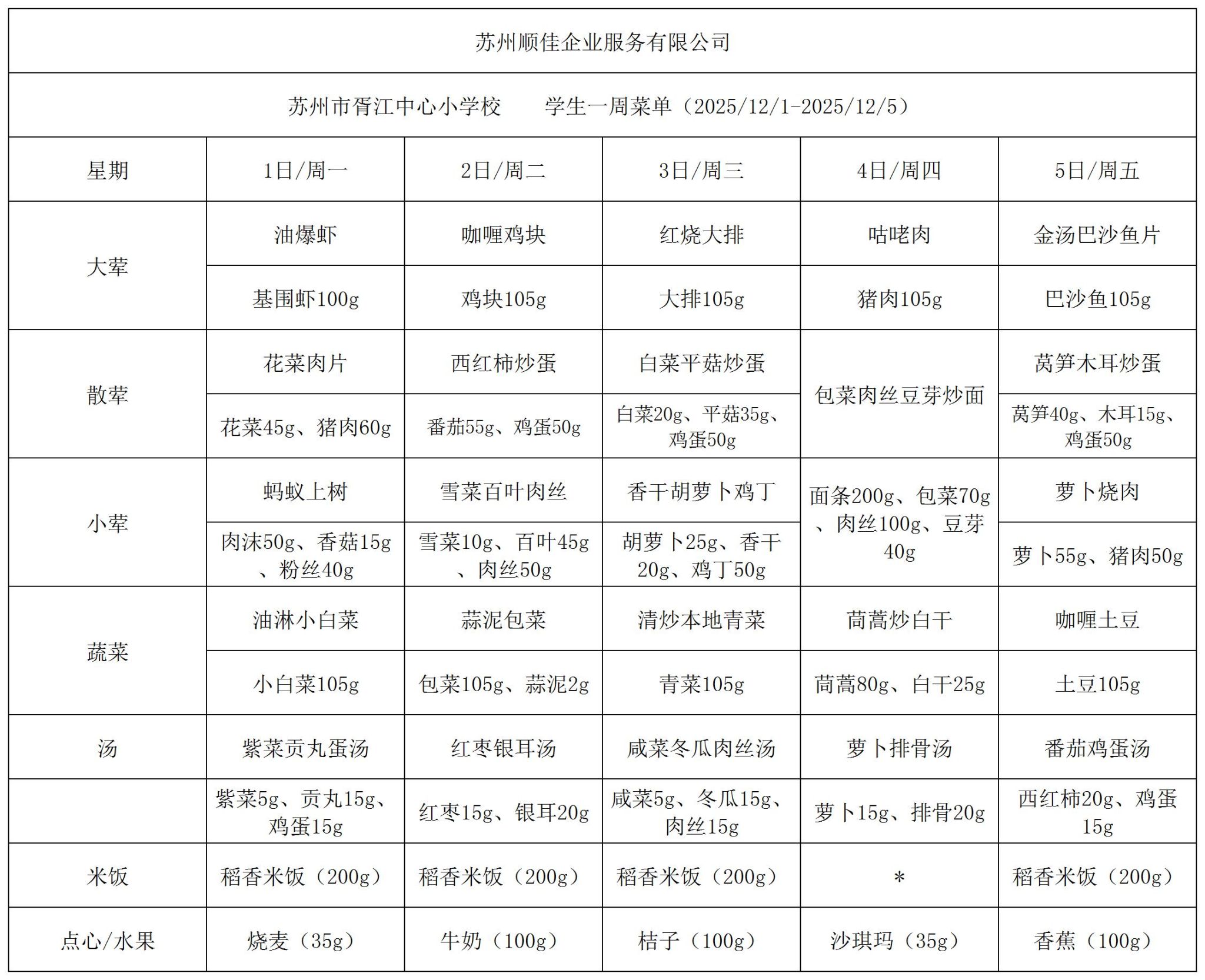 苏州市胥江中心小学校每周食谱2025.12.1-2025.12.5