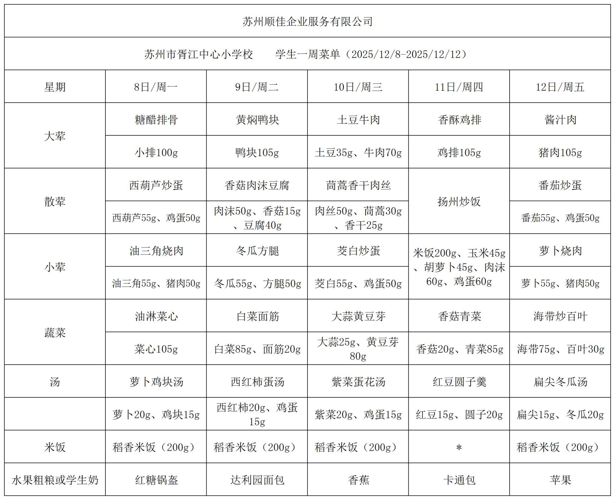苏州市胥江中心小学校每周食谱2025.12.8-2025.12.12