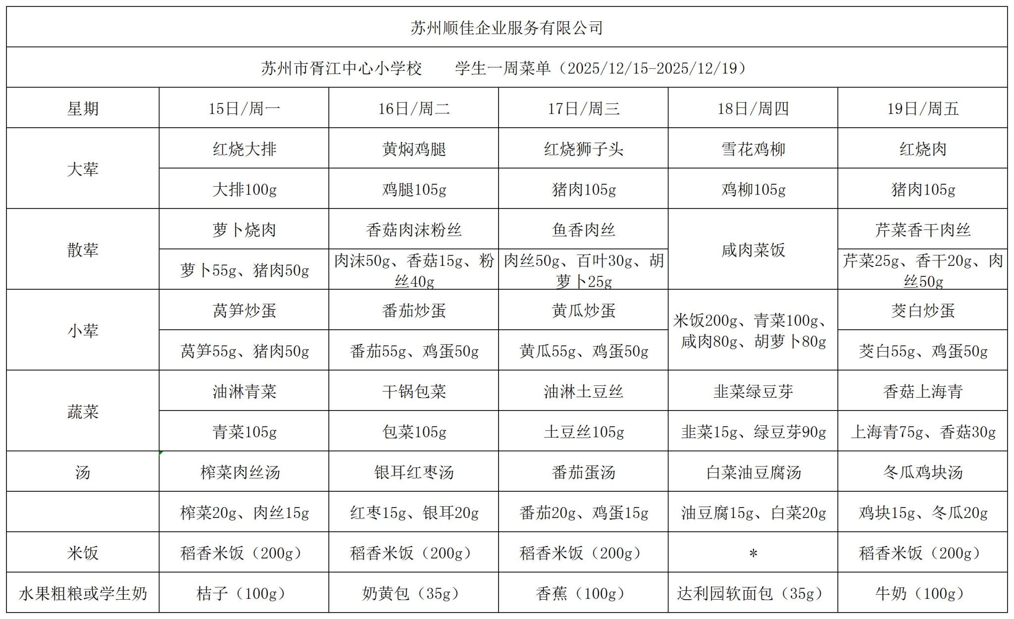 苏州市胥江中心小学校每周食谱2025.12.15-2025.12.19