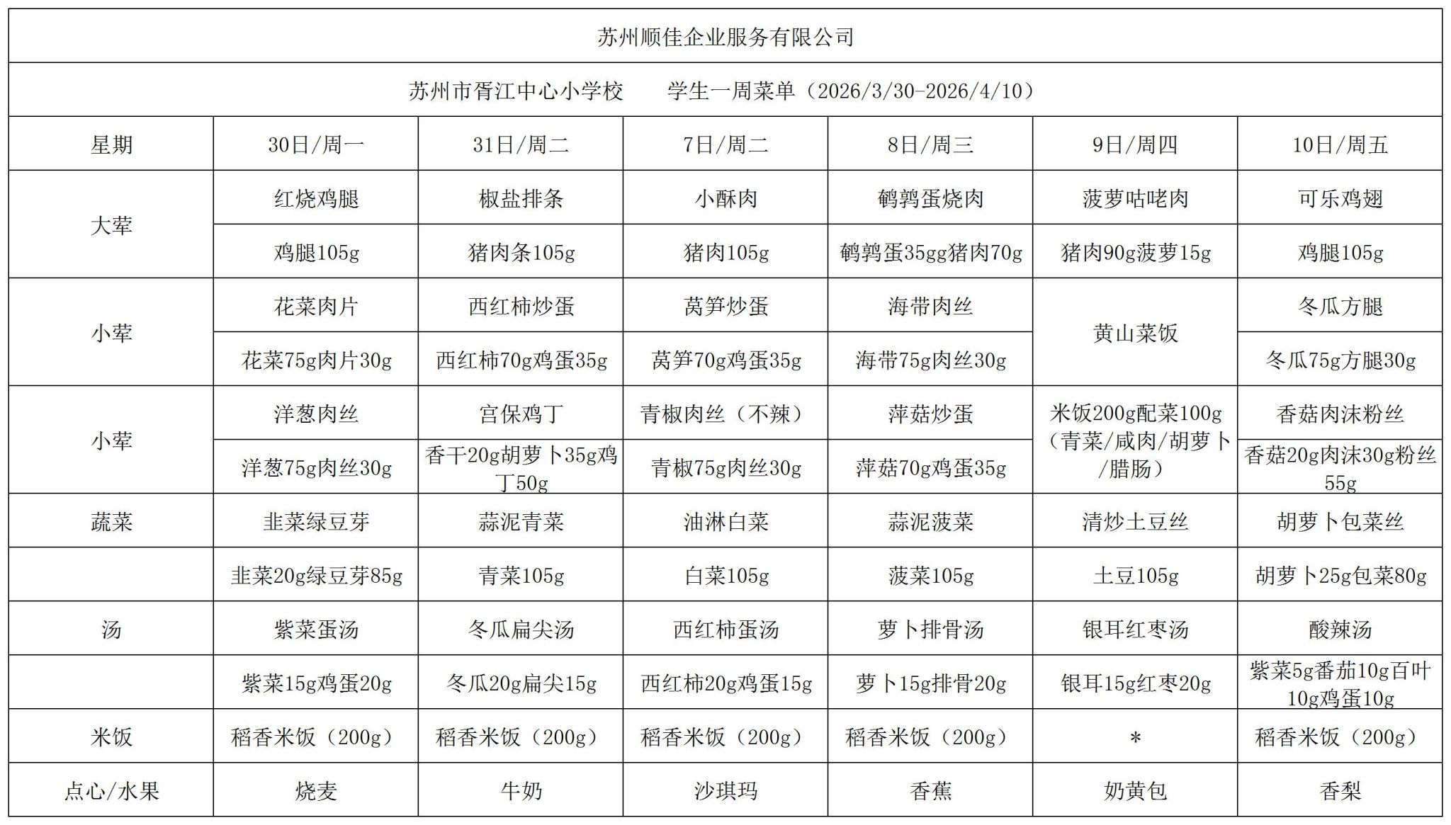 苏州市胥江中心小学校每周食谱2026.3.30-2026.4.10